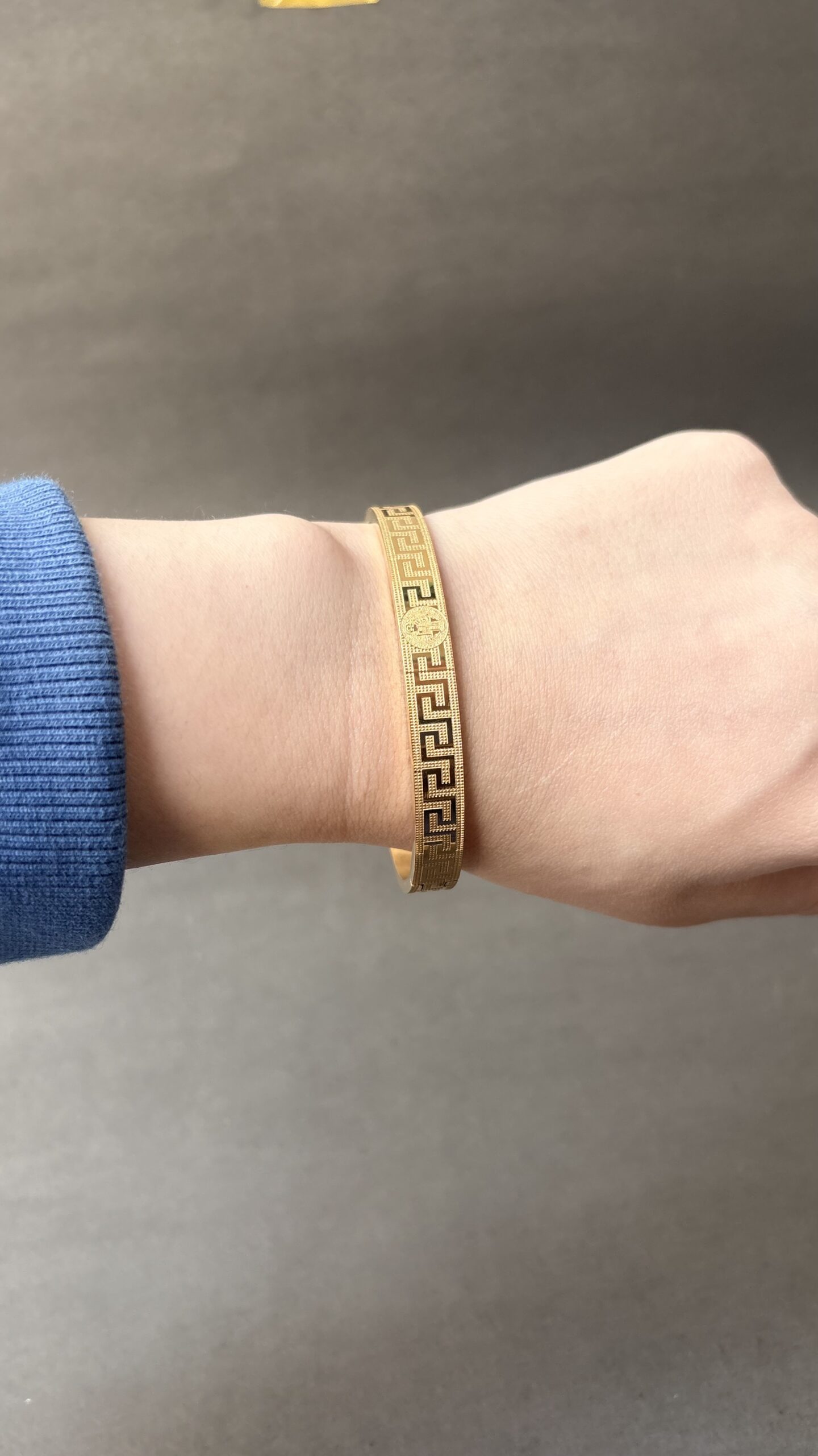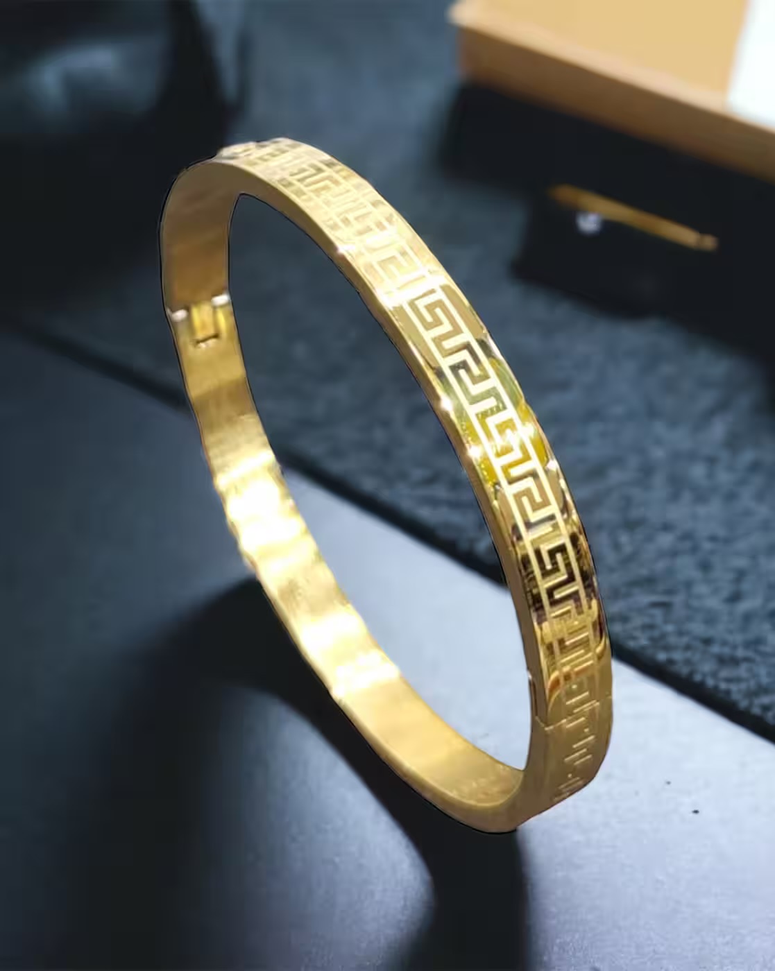 - Sleek gold-tone bangle with an engraved Greek key pattern.