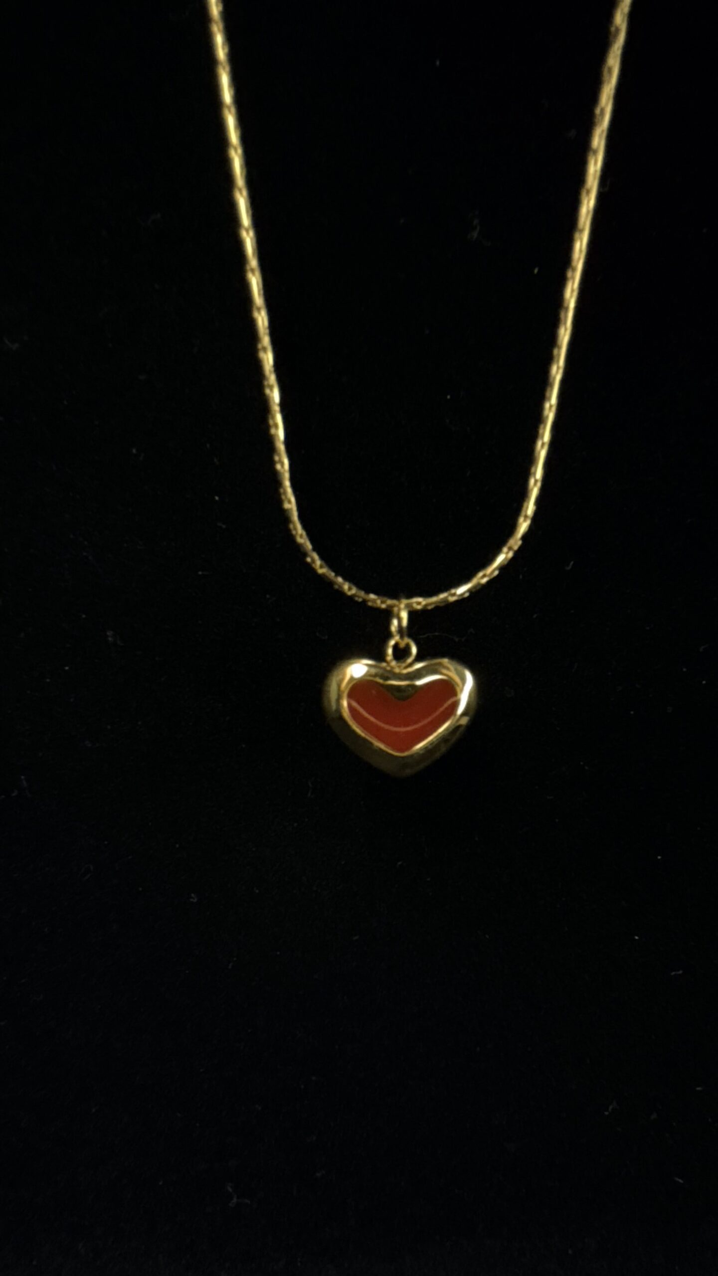 Elegant gold tone chain featuring a glossy red heart pendant